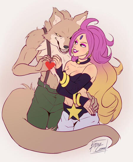 @PoisonousCoyoteAfter the preliminary match ups, Rainy and Lavender had met upon an unclaimed planet between universes. Recognizing that they were both on opposing universes, the two immediately began to square off. Losing the battle to the coyote, with his cheating poisonous tricks, Lavender took advantage of the Princess in the worst way possible and nearly ended up killing her. Luckily, the coyote wasn't that cruel. He offered her some of the universal 9 fruit to heal her of the poison ailments. In exchange, she'd have to become his โservantโ. Over time, Rainy defeats Lavender several times and the two become rivals and gain an โunderstandingโ. The two are forever fighting physically and verbally.Sometime down the line, Lavender meets a horrific fate and actually ends up risking his own life to save Rainy from a common enemy. During this time, Rainy forms a friendship with his other two Trio Brothers and vows to wish him back.A very weird and intense relationship these two have. They are completely mismatched in every way possible, yet they cannot keep their hands off of each other. After years of arguing and fighting, Lavender actually asks Rainy out, where she actually agrees and refuses to deny her attraction any further. She loves her wolf boy.After the two move in together and become even closer, Lavender and Rainy end up having a child together; Artemis. Itโs then that the coyote proposes to Rainy, pairing them together as husband and wife._____________________________